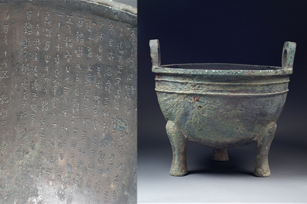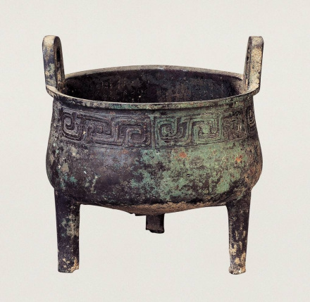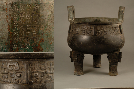 鑄于周康王時期,造型敦厚雄偉,紋飾莊重神奇。通高77厘米,口徑56.5厘米。立耳,深腹,平沿方唇,三柱足?谘叵嘛椄〉駹铟吟鸭y,地襯細雷紋。三足根部飾大饕餮面。雙耳外側(cè)各飾一條曲體上緣的夔龍。腹外壁及底部厚積煙跡,顯系長期使用所致。腹內(nèi)壁鑄有銘文28字。旟鼎承襲商代圓鼎風(fēng)格,造型厚重莊嚴(yán),紋飾十分精美,所刻銘文是研究周初土地制度的重要史料,具有珍貴的歷史及藝術(shù)價值,加之鑄刻時代明確,被公認(rèn)為周康王時的標(biāo)準(zhǔn)器,是一尊著名的西周時期的國寶。