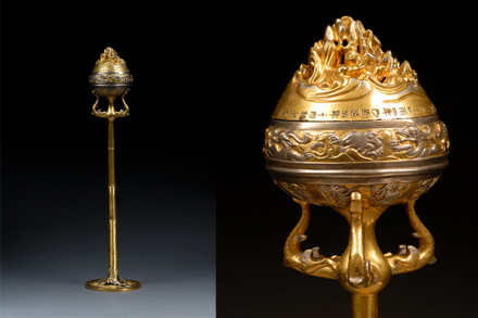 通高58厘米,口徑9厘米,底徑13.3厘米,重2.57公斤。高柄竹節(jié)豆形,蓋如博山,通體鎏金鋈銀,圈足底盤透雕兩蟠龍,均以頭承托盤腹,盤腹下部有十組三角形,內(nèi)雕飾蟠龍紋,龍首回顧,龍身從波濤中騰出,線條流暢,造型奇妙。爐口外側(cè)刻銘文一周135字。熏爐原為未央宮之物,后來被賞賜給漢武帝姊陽信長公主家。中國古代香爐,以漢晉間流行的博山爐最為精美,而此爐又為所見博山爐中最精美者,是古代罕見的藝術(shù)品。
