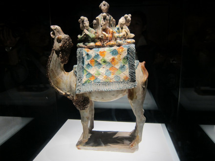 通高58厘米,高24.2厘米,口徑12.4厘米,足徑14.3厘米。典型的盛唐時期的作品,舞樂者均穿著漢族衣冠,使用的卻大都是從西域傳入的樂器,表現(xiàn)的是流行于開元、天寶時期的“胡部新聲”的新舞樂。這組俑以狹小的駝背作舞臺,卻承載陣容龐大的樂隊來表現(xiàn)當(dāng)時流行的新舞樂,大膽運用了藝術(shù)夸張,充滿想象與浪漫。制作工藝精湛,形態(tài)逼真?zhèn)魃,使人仿佛耳聞悠揚的樂曲。釉色鮮明亮麗,協(xié)調(diào)自然,堪稱唐三彩中的極品。不僅具有很高的藝術(shù)欣賞價值,對研究盛唐時期的音樂、歌舞以及中外文化交流也具有重要的參考價值。