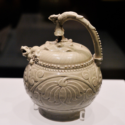 這件提梁倒灌壺是著名的耀州窯(窯址在今陜西省銅川市王益區(qū)黃堡鎮(zhèn))產(chǎn)品。耀州窯是唐宋時中國北方名窯,時人推崇耀瓷“巧如范金,精比琢玉”。此壺造型古樸典雅,制作規(guī)整精細,紋紋繁褥華麗,尤其是構(gòu)思奇特,設(shè)計巧奪天工,被認(rèn)為是國內(nèi)外存世耀州窯瓷器中最為精美的一件。