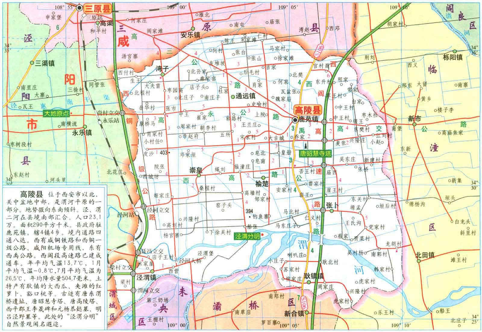 高陵縣地勢(shì)平坦,土壤肥沃,人稱(chēng)關(guān)中的“白菜心”。東靠臨潼區(qū),南接未央、灞橋區(qū),西連咸陽(yáng)渭城區(qū)、三原縣、涇陽(yáng)縣,北臨閻良區(qū),屬西安市近郊縣,距西安市中心僅20公里,距咸陽(yáng)國(guó)際機(jī)場(chǎng)10公里。涇渭二水橫貫東西,西禹、西銅高速公路、210國(guó)道及西延鐵路橫貫?zāi)媳保瑳芎踊疖?chē)站位于其中。“五區(qū)、二水、四線”已緊密地把高陵縣與西安市融為一體。