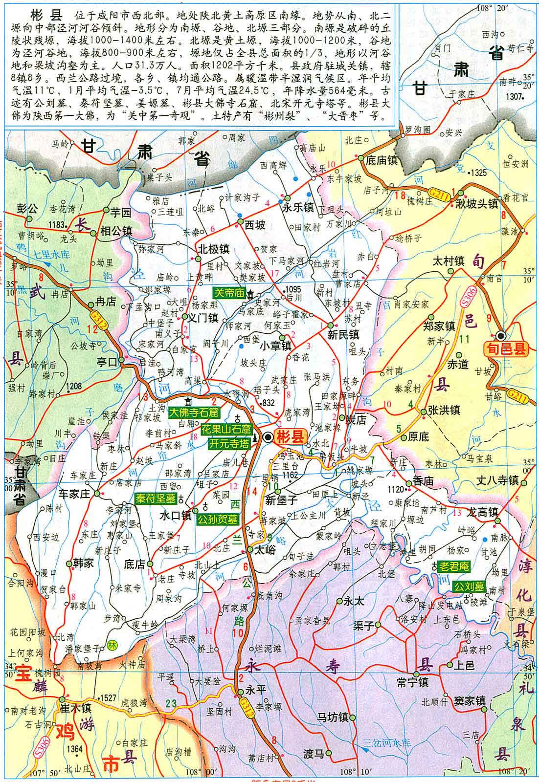 彬縣位于陜甘兩省交界處,南距咸陽120公里、西安150公里,北距甘肅平?jīng)?60公里,是連接秦隴的咽喉要道。全縣版圖形似正寫的“人”字,涇河自西而東斜貫其中,將全縣分為南北兩塬一道川。全縣轄8鎮(zhèn)8鄉(xiāng)246個(gè)行政村,總?cè)丝?2萬,其中農(nóng)業(yè)人口28.8萬,總面積1183平方公里,耕地面積60萬畝。彬縣歷史悠久,是中國(guó)古代農(nóng)業(yè)的發(fā)祥地之一。