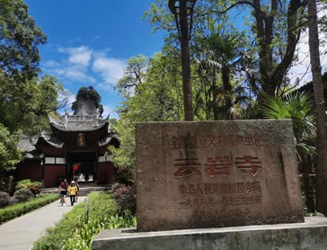 峰下不遠(yuǎn)處為云巖寺,始建于唐,明末焚于兵火,清雍正三年(1725年)重修。寺前山門外有唐李白題贊圌山石碑一通,謂:"樵夫與耕者,出入畫屏中。"寺內(nèi)珍藏有道教文物“飛天藏”;“飛天藏”又名“星辰車”,宋淳熙八年(1181)建,元代至正時(shí)重修,車高9.82米,直徑7米,上下共四層,上雕塑有天宮樓閣,腰檐上裝飾有斗拱,每層雕有執(zhí)笏人物,形神自如,體態(tài)瀟灑,衣紋流暢,木柱及額枋上均施瀝粉彩繪,更顯精美巧妙,具有一定的歷史、科學(xué)、藝術(shù)價(jià)值,屬道教文物。1956年被四川省人民委員會(huì)公布為第一批省級(jí)文物保護(hù)單位。