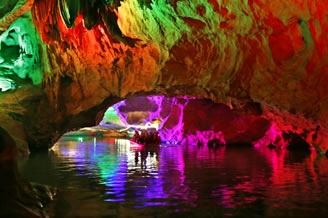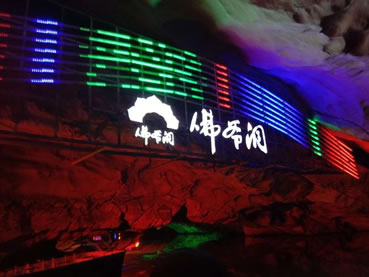由南天門往右,沿著崎嶇的“盤陀路”進(jìn)入第二殿,隨著“一柱廳”、“半天山”到達(dá)約有450平方米寬的“東海龍宮”那里“定海神針”直立,“五彩神泉池”水色清澈晶瑩,不寒而栗有“白龍?jiān)浇瓓Z寶”、“頑猴望”、“海獅戲蓮”、“別甲神鷹鎮(zhèn)金沙”、“龍王百寶箱”等天然造型,氣勢(shì)磅礴,極為壯觀。龍宮內(nèi)洞中有洞、景中有景。“武陵園”有牛角尖、簸箕天,海螺洞中有“鶴蚌相爭(zhēng)”、“海螺觀戰(zhàn)”、“鳴鑼助戰(zhàn)”、“石床”等石筍、鐘乳石造型,相映成趣,目不暇接。然而,“山有洞天不算奇,陰河劃船數(shù)第一”。沿著灣灣曲曲的跳蹬路,耳聽(tīng)潺水聲,觀看“地海橫鯨”、“青蛙駝蓮”、“天地桃”、“美猴照鏡”等景點(diǎn)來(lái)到陰河劃船處——“凱旋門”、只見(jiàn)幽幽碧水,微泛漣漪,各種燈光倒映水中的燈景冉冉浮動(dòng)。