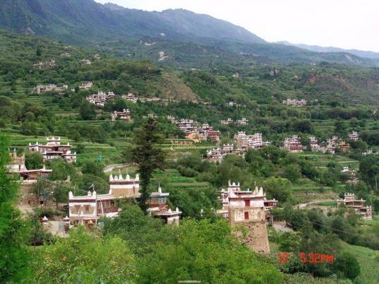 “甲居”,藏語是百戶人家之意。藏寨從大金河谷層層向上攀緣,一直伸延到卡帕瑪群峰腳下,整個山寨依著起伏的山勢迤邐連綿,在相對高差近千米的山坡上,一幢幢藏式樓房灑落在綠樹叢中;蛐橇_棋布,或稠密集中,或在高山懸崖上,或在河壩綠茵間,不時炊煙裊裊、煙云繚繞,與充滿靈氣的山谷、清澈的溪流、皚皚的雪峰一起,將田園牧歌式的畫卷展示在人們眼前,以一種藝術品的形態(tài)存在。2005年由《中國國家地理》雜志組織的選美中國活動中,以甲居藏寨為代表的“丹巴藏寨”被評為“中國最美的六大鄉(xiāng)村古鎮(zhèn)”之首。