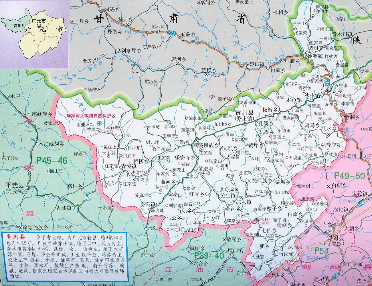 青川縣轄9個鎮(zhèn)、25個鄉(xiāng)、2個民族鄉(xiāng)、1個國家級自然保護(hù)區(qū):