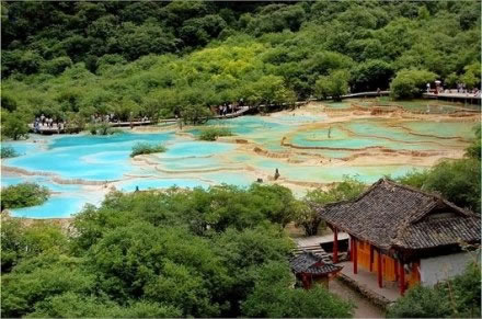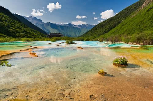 進(jìn)入黃龍景區(qū),首先看到的是一組精巧別致、水質(zhì)明麗的池群--迎賓池。池子大小不一,形狀奇特,色彩艷麗,錯(cuò)落有致,四周山岳環(huán)峙,林木蔥蘢,山間野花競(jìng)放,彩蝶飛舞。山間石徑曲折盤(pán)旋,點(diǎn)綴著觀景亭閣,倍添情趣。