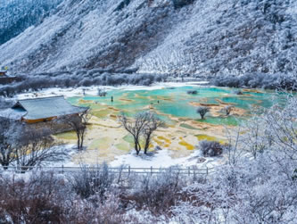 位于岷山主峰雪寶頂,下臨涪江源流——涪源橋,是一條長(zhǎng)7.5公里、寬1.5公里的緩坡溝谷。溝內(nèi)布滿乳黃色巖石,遠(yuǎn)望好似婉蜒于密林幽谷中的黃龍,黃龍溝名即來(lái)源于此。明代(公元1368~1644年)在此修建了黃龍寺,用以奉祀黃龍。黃龍溝以它“奇、絕、秀、幽”的自然景觀而蜚聲中外,它酷似中國(guó)人心目中“龍”的形象,藏民稱之為“東日·瑟爾磋”,意為東方的海螺山(指雪寶頂)、金色的海子(指黃龍溝),并沿襲著一年一度盛況煊赫、波及西北各省區(qū)各族民眾參加的轉(zhuǎn)山廟會(huì)。 黃龍溝連綿分布鈣化段長(zhǎng)達(dá)3600米,最長(zhǎng)鈣化灘長(zhǎng)1300米,最寬170米;彩池?cái)?shù)多達(dá)3400余個(gè);邊石壩最高達(dá)7.2米。