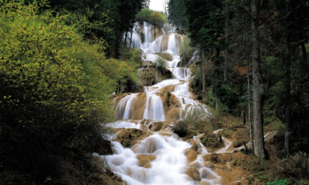 在牟尼溝風(fēng)景區(qū)原始大森林中,有一睽巨大的水流自104米高的臺(tái)階式鈣華化巖體上,洶涌咆哮著似自九天直傾而下,氣勢(shì)極為壯觀,它是我國(guó)最大的鈣化瀑布——扎嘎大瀑布。 扎嘎瀑布地處海拔3270米,瀑高93.2米,寬35米。上游是湖泊,下游為一串階梯式河床。上百個(gè)層層疊疊的鈣化環(huán)型瀑布玉串珠連,經(jīng)三級(jí)鈣化臺(tái)階跌宕而下,沖擊成巨大鈣化面而形成朵朵巨大白花,瀑聲如雷,聲形兼?zhèn)。在大瀑布第二階的鈣化壁上,有一“水簾洞”,洞口水流飛掛,洞內(nèi)氣象萬(wàn)端。