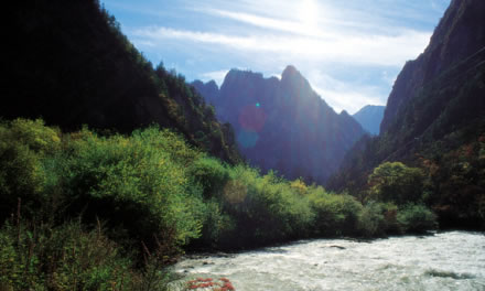 丹云峽以俊秀印峽谷風(fēng)光,成為黃龍的“五絕”之一。它擁有豐富的樹(shù)種、灌木和花草,是植物愛(ài)好者的天堂。丹云峽景區(qū)起子玉筍群峰,止于扇子洞,綿延18.5公里,落差1300米,峰谷高差為1000至2000米。這里冬天一片雪白,夏天山林翠綠,尤其是春天漫山遍野的紅杜鵑、秋天一路楓葉紅遍峽谷,那情景仿佛夕陽(yáng)之下的火燒云從天而降,丹云峽因此而得名。山生云,樹(shù)生風(fēng),丹云峽幾乎每天都有云霧從林中升起,繚繞山間,時(shí)隱時(shí)現(xiàn)。丹云峽內(nèi)森林密布,發(fā)源于雪寶頂?shù)母⒔趰{內(nèi)奇石怪巖的夾逼中奔游林間,好似一條白龍搖頭擺尾,與身邊的黃龍遙相呼應(yīng)。