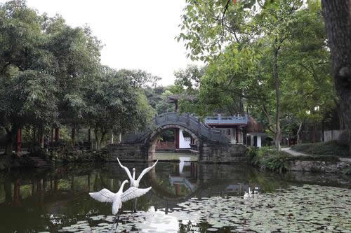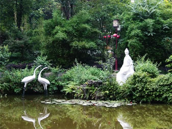 過蓮池旁的“山谷小憩”,亦為園中一景。其間,黃庭堅(jiān)身著便裝,手拿書卷,在池旁靜坐沉思。兩只白鶴立于水中相伴,此景也稱“雙鶴伴涪翁”,優(yōu)雅清新,寓味深長(zhǎng),形象地表現(xiàn)了黃庭堅(jiān)在謫居戎州時(shí),平和豁達(dá)的心態(tài)。