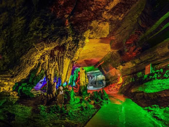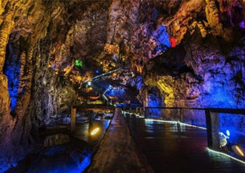 位于牛角嵌北3500米,可游面積約7萬平方米,由三殿、七庭和“洞中西!、“洞中棧道”等十二大景觀組成。主洞深2000余米,高30—80米,洞內(nèi)塔柱林立,陰河幽邃,四壁乳石滿布,形狀神奇,氣勢(shì)宏偉,置身洞中,令人頓覺莊嚴(yán)肅穆。其中的“乳石蓮花”、“定海神針”、“珍珠玉盤”、“金龜戲水”和古水文線遺跡堪稱絕景。