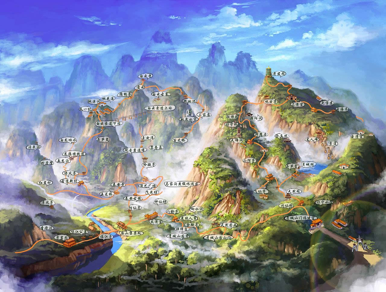 青城山分前、后山。前山是青城山風景名勝區(qū)的主體部分,約15平方千米,景色優(yōu)美,文物古跡眾多,主要景點有建福宮、天然圖畫、天師洞、朝陽洞、祖師殿、上清宮等;后山總面積100平方千米,水秀、林幽、山雄,高不可攀,直上而去,冬天則寒氣逼人、夏天則涼爽無比,主要景點有金壁天倉、圣母洞、山泉霧潭、白云群洞、天橋奇景等。