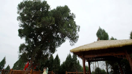 民間關(guān)于神仙樹的美麗傳說很多,相傳某年的八月八日,不知何方的一高一矮,一胖一瘦,一位仙風(fēng)道骨,一位邋遢放浪的老者,飄然來到尖包嶺,點(diǎn)石為枰,碎石為棋,以石為凳,手談對弈。棋勢變幻之間,四周時(shí)而雷霆激蕩,時(shí)而風(fēng)和日麗,時(shí)而萬物沉寂。這樣,不知過了多少時(shí)候,兩位老者抹掉棋枰,拂去棋子,背北面南,嘴里念念有詞,手里比比劃劃,頃刻間,尖包嶺大雨傾盆,繼而和風(fēng)細(xì)雨,云蒸霞蔚,兩位老者飄然而去,所坐之地變成了五花石,形如花瓣的五花石中間長出兩棵高低錯(cuò)落、枝繁葉茂的翠柏。從此,人們就把翠柏叫作“神仙樹”,把 “尖包嶺”叫作“神仙梁”。又有民間記載:仙海湖所在沉香鋪(現(xiàn)名沉抗鎮(zhèn))是民間傳說《寶蓮燈》中三圣母之子沉香生長和得道升仙的地方。據(jù)《廣異記》載:沉香大孝,其母被二郎神楊戩壓于華山之下,沉香以神、斧打敗二郎神,劈山救母,而神仙樹就是沉香仙子母子二人化身而來的兩株古樹,交織相連,撐天而起,屹立山巔,母子倆以深情目光,凝視著天下樹,庇護(hù)這天下蒼生。