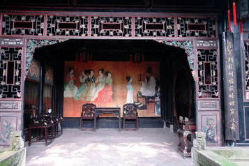 工字廳的正前方有一臺階。臺階上方是戲臺。臺前立柱上有一副對聯(lián):“移影換形儼然君臣父子,假哭真笑表達離合悲歡”,構思精妙,立意深刻,無聲地向人昭示:這里是戲劇的天地。臺口左右華板上雕刻著《白蛇傳》中的“船舟借傘”和《西廂記中》的“鶯鶯聽琴”。人物形神畢現(xiàn),栩栩如生。臺前的落地罩精致絕倫,有關專家學者稱贊其“集中國民間傳統(tǒng)木雕之精華”,自是當之無愧,其雕刻內(nèi)容,有歷史故事,如“黃道州發(fā)兵抗清”;有戲劇故事,如“別窯從軍”;有的取材于唐詩,如“尋隱者不遇”、“清明詩”等,有民間傳說,如“羊有跪乳之恩、烏有反哺之義”;有的采用諧音、象征手法表現(xiàn)美好的意愿的傳統(tǒng)圖案,如“掛印封候”、“富貴白頭”、“路路通順”等。