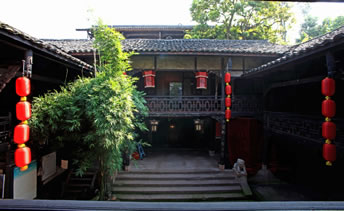 王朝聞故居(添壽堂)位于古鎮(zhèn)進士牌坊下側(cè),立木結構,是川南典型四合院,面積500平方米,院內(nèi)天井50平方米,有明代古井一口,一方戲樓,三方廂樓,木雕精美。故居分為戲樓、正堂、客廳、臥室、天井、作坊室、偏房等。正堂供奉神龕、神案,左右置太師椅。作坊室是王朝聞少年時代使用的碾子、龍骨車、風簸、簸箕、撮箕、蓑衣、斗筐、鋤頭、犁耙等。
