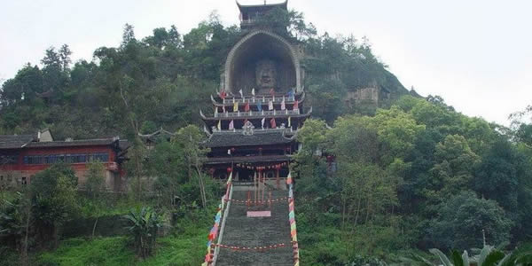 榮縣大佛:榮縣城東0.5公里有全國第二大佛——榮縣大佛,大佛寺內(nèi)半山之上,有一尊巍峨的石刻如來坐佛佛像,世稱榮縣大佛。大佛依山崖鑿成,通高36.67米,頭長8.76米,肩寬12.67米,膝高12米,腳寬3.5米,其頭部長8.76米,肩寬12.67米,腳寬3.5米。是一尊如來佛像,僅次于樂山彌勒大佛,為中國第二石刻大佛!s縣大佛開鑿于北宋元豐八年(公元1085年),完工于公元1092年,歷時八年始完工。大佛的頭頂上方有一道石條卷拱護(hù)罩,上刻“大開覺路”四字;崖頂上還有磚閣一座,遠(yuǎn)看像在戴在大佛頭頂上的寶冠!〈蠓痂徔掏旯ず,即修有殿宇保護(hù),根據(jù)《古今圖書集成》記載,時有“架殿十層,高四十七丈,闊十五丈”、“舊時寺門、抵今溪岸”?梢姰(dāng)時的恢宏氣勢,其后幾毀幾修,現(xiàn)存的殿宇為清代嘉慶、道光年間所建。1988年重建的大佛護(hù)身樓,是仿木仿古重檐歇山式建筑,既保護(hù)了大佛,又具游覽價(jià)值,逐層登樓近瞻佛容慈顏,從上到下盡觀大佛偉岸雄姿,鳥瞰榮城風(fēng)貌,眺望遠(yuǎn)山近巒。