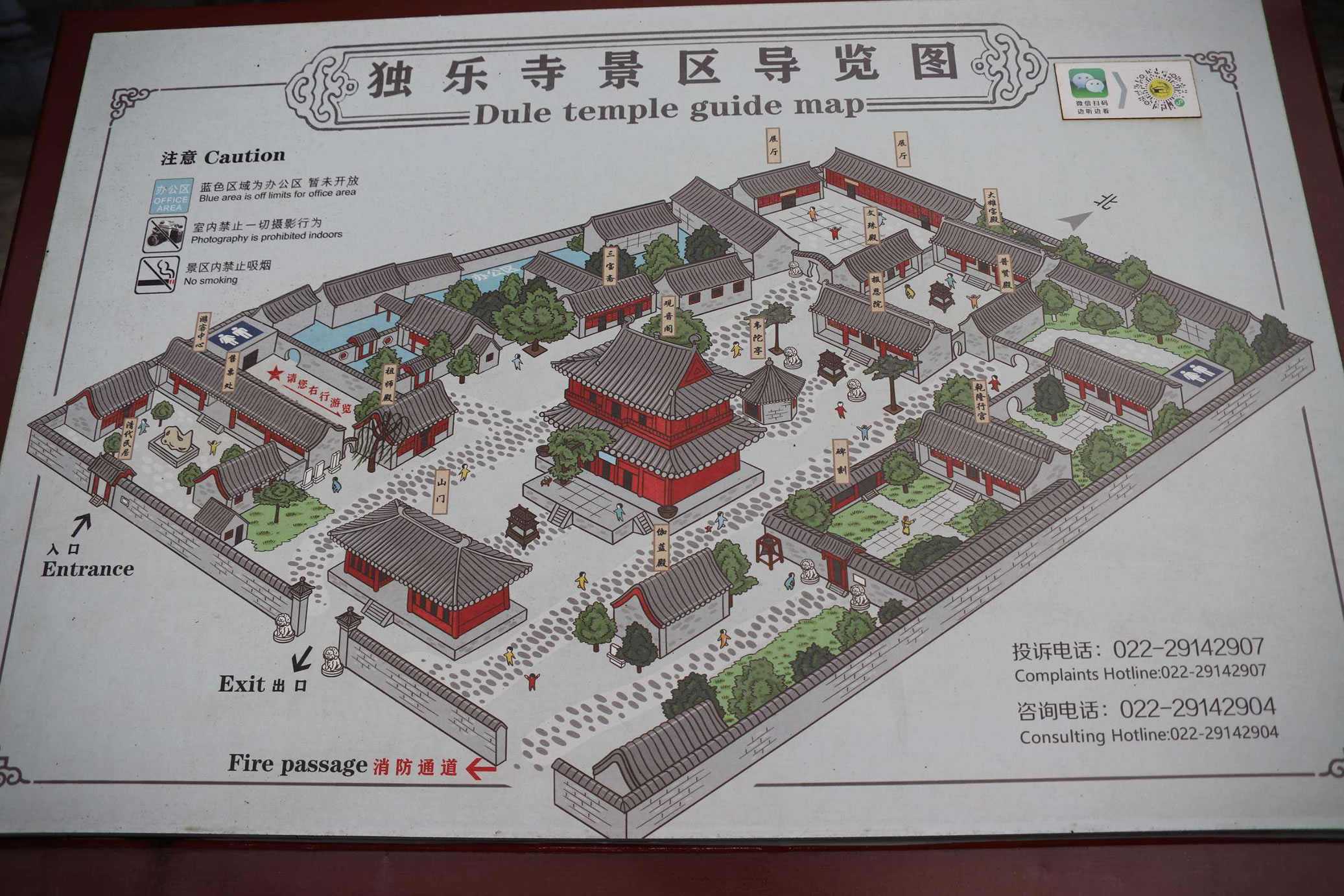 獨(dú)樂寺山門和觀音閣為遼代建筑,其它都是明、清所建。全寺建筑分為東、中、西三部分;東部、西部分別為僧房和行宮,中部是寺廟的主要建筑物,白山門、觀音閣、東西配殿等組成,山門與大殿之間,用迥廊相連結(jié)。山門面闊三間,進(jìn)深兩間,斗拱相當(dāng)于立柱的二分之一,粗壯有力,為典型唐代風(fēng)格,是中國(guó)現(xiàn)存最早的廡殿頂山門。 山門內(nèi)有兩尊高大的天王塑像守衛(wèi)兩旁,俗稱“哼”“哈”二將,是遼代彩塑珍品。獨(dú)樂寺山門正脊的鴟尾,長(zhǎng)長(zhǎng)的尾巴翹轉(zhuǎn)向內(nèi),猶如雉鳥飛翔,是中國(guó)現(xiàn)存古建筑中年代最早的鴟尾實(shí)物。