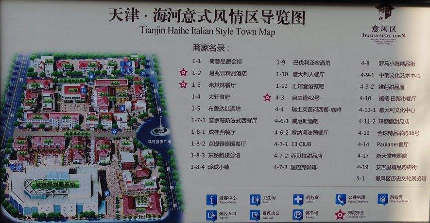 意式風(fēng)情區(qū)內(nèi)包含河北區(qū)進(jìn)步道、民族路、民主道、民生路、自由道、光復(fù)道、光明道等多條道路,是意大利在境外唯一的租界,亦是一處具有意大利風(fēng)格的大型建筑群。有梁?jiǎn)⒊⒉茇、張廷諤、曹錕、袁世凱、齊耀珊、張學(xué)銘、曾國(guó)藩家族、馮國(guó)璋、李叔同、湯玉麟、盧鶴紱、王卓然、劉髯公、程克、鮑貴卿、華世奎、易兆云、李廷玉、張鳴岐、李文田、章宗祥、孫良誠(chéng)、倪嗣沖、段芝貴、王一民、王郅隆、黃郛、曹銳、盧木齋、鄭誦先、黎元洪、安文忠、楊以德、齊耀琳、呂調(diào)元、靳云鵬、龔心湛、王占元等多處中國(guó)名人故居。