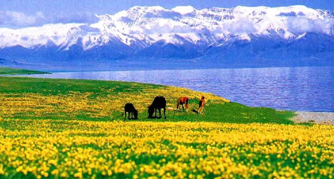 賽里木湖古稱“凈!,位于中國(guó)新疆博爾塔拉州博樂市境內(nèi)的西天山山脈中,緊鄰伊犁州霍城縣,是一個(gè)風(fēng)光秀美的高山湖泊。賽里木湖湖面海拔2073米,水深85公尺,東西長(zhǎng)約30公里,南北寬約25公里,周長(zhǎng)90公里,水域面積460平方公里,是新疆海拔最高、面積最大的高山冷水湖。 [16]賽里木湖蒙語(yǔ)稱“賽里木淖爾”,意為“山脊梁上的湖”,面積約458平方公里,水質(zhì)透明度達(dá)10—12米。