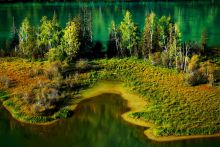 變色湖位于喀納斯湖中央。春夏時(shí)節(jié),湖水會(huì)隨著季節(jié)和天氣的變化而變換顏色。從每年的四五月間開化到11月冰雪封湖,湖水在不同的季節(jié)呈現(xiàn)出不同的色彩。5月的湖水,冰雪消融,湖水幽暗,呈青灰色;到了6月,湖水隨周山的植物泛綠,呈淺綠或碧藍(lán)色;7月以后為洪水期,上游白湖的白色湖水大量補(bǔ)給,由碧綠色變成微帶藍(lán)綠的乳白色;到了8月湖水受降雨的影響,呈現(xiàn)出墨綠色;進(jìn)入9、10月,湖水的補(bǔ)給明顯減少,周圍的植物色彩斑斕,一池翡翠色的湖水光彩奪目。