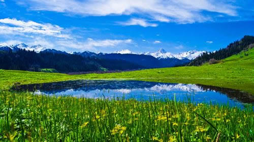 從闊谷東側(cè)穿林攀山而上,眼前一望無際,遼闊美麗的草原就是頗具勝名的庫爾德寧大草原。草原上山花爛漫,牛羊蠕動,群馬奔騰,處處都是“風吹草地見牛羊”的動人景象;山灣溪畔,密林排映之下是氈房點點,炊煙裊裊;極目遠眺,天際處,皚皚雪峰在陽光照射下,幻化出五顏六色的光芒;齊齊的林線下是郁郁蔥蔥,綿延不絕的茫茫林海;藍天上,白云朵朵,雄鷹展翅翱翔;在草原西南側(cè),鑲嵌著一面園月以的小湖,水平如鏡,清澈見底,天光云彩,湖中徘徊,詩情畫意油然而生。日暮時分,夕陽如血,霞飛滿天,光移景動,山色朦朧,群山露紅,層林盡染,更是難得的景致。庫爾德寧草原風光無限,美麗如畫,令人目不暇接。 |
