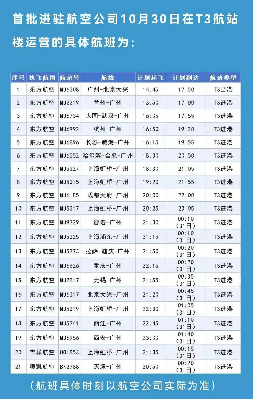 10月31日起,東方航空、上海航空、中國(guó)聯(lián)合航空、吉祥航空、奧凱航空的國(guó)內(nèi)進(jìn)出港航班均調(diào)整至白云機(jī)場(chǎng)T3航站樓運(yùn)營(yíng),東方航空的國(guó)際航班暫保留在T1航站樓運(yùn)營(yíng)。