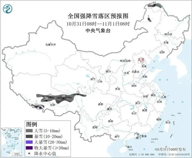 中央氣象臺10月31日6時繼續(xù)發(fā)布暴雪藍色預(yù)警:預(yù)計10月31日8時至11月1日8時,西藏中東部和西南部、川西高原北部、黑龍江西北部、內(nèi)蒙古東北部等地部分地區(qū)有大到暴雪,其中,西藏中部局地有大暴雪,西藏西南部局地有大暴雪或特大暴雪(30~35毫米)。上述部分地區(qū)新增積雪深度4~8厘米,山區(qū)局地可達15厘米以上。