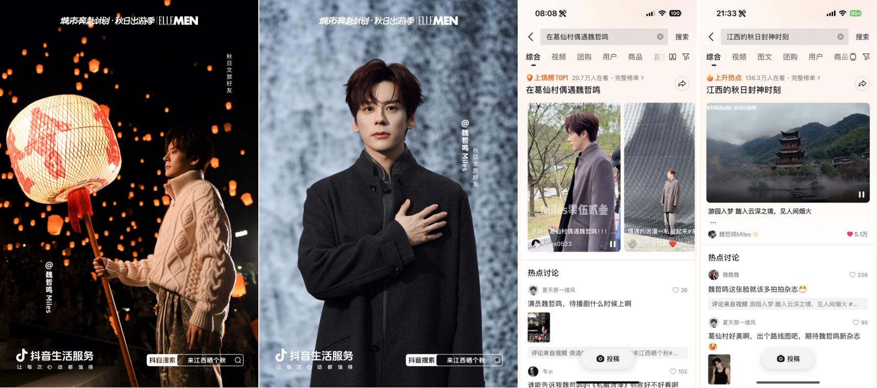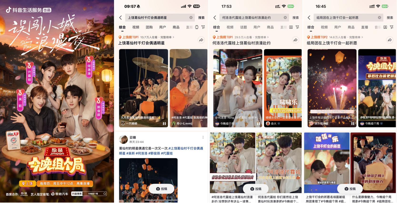 抖音牽手“秋日男友”魏哲鳴前往江西上饒葛仙村拍攝文旅宣發(fā)視頻引發(fā)廣泛關(guān)注,路透內(nèi)容#在葛仙村偶遇魏哲鳴 登上上饒同城榜TOP1;主視頻發(fā)布后,#江西的秋日封神時(shí)刻 更登頂同城榜及全國種草榜TOP6。活動(dòng)還與綜藝《今晚組個(gè)局》實(shí)現(xiàn)聯(lián)動(dòng),吳昕、代露娃、郭俊辰、何洛洛等明星演員前往上饒拍攝定制化文旅內(nèi)容,#上饒葛仙村千燈會(huì)偶遇明星 #何洛洛代露娃上饒葛仙村浪漫赴約 等路透內(nèi)容與節(jié)目看點(diǎn)登頂上饒同城榜TOP1,#組局團(tuán)在上饒千燈會(huì)一起祈愿 搶占同城榜TOP2。明星效應(yīng)有效激發(fā)用戶出行意愿,葛仙村交易額同比403%顯著增長(zhǎng),持續(xù)引爆目的地&商家出圈。