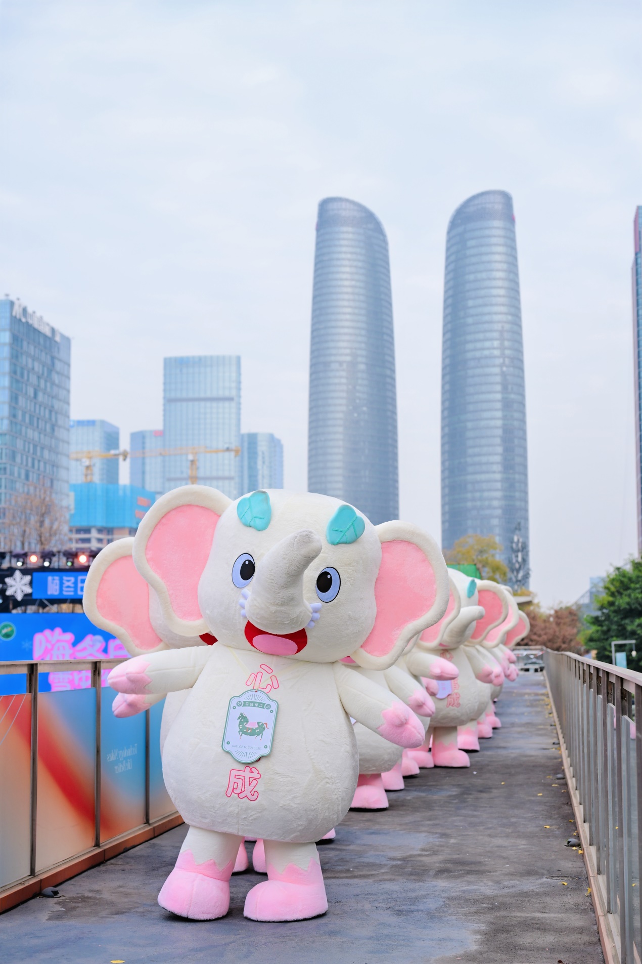 此次登陸成都的“福象巡游”,堪稱冬日文旅盛宴的點睛之筆,其文化內(nèi)核源自峨眉山極具代表性的祥瑞符號——六牙白象。圣潔白象煥新蛻變萌趣福象六六,依托“象”與“祥”的諧音之妙,圣潔莊重的六牙白象幻化身為萌態(tài)十足的小福象,既延續(xù)了白象承載的吉祥庇佑之意,更將“峨眉耍雪・心象事成”的內(nèi)涵詮釋得淋漓盡致,成為冬日里最治愈的祥瑞福氣天團。“耍雪”是峨眉山冬季獨有的極致浪漫,金頂皚皚白雪的圣潔壯闊、林間戲雪的肆意歡騰,是鐫刻在每個人心中的冬日終極向往;“心象事成”則暗藏滿滿期許,飽含人們對冬日美好景致的熱切期盼,以祥瑞之氣傳遞祝福,寓意奔赴峨眉耍雪尋福之人,皆能心愿順遂、萬事勝意。27只小福象精準復(fù)刻六牙白象的靈動神韻,從仙氣繚繞的峨眉仙山走進煙火繁盛的都市街巷,讓仙山的靜謐禪意與都市的熱鬧活力完美交融。