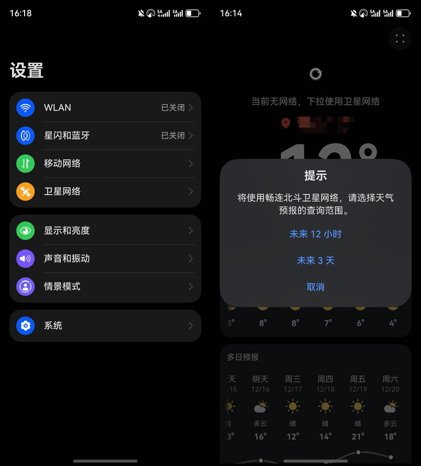 哪怕營地完全沒有信號,現在也不用慌。有網絡時提前在設置-衛(wèi)星網絡里打開“暢連北斗衛(wèi)星消息”后,我可以切換到衛(wèi)星網絡模式,能查看未來12小時、最長3天的天氣數據。手里有這個戶外神器,再也不必擔心與世隔絕和天氣突變了。
