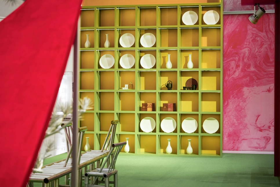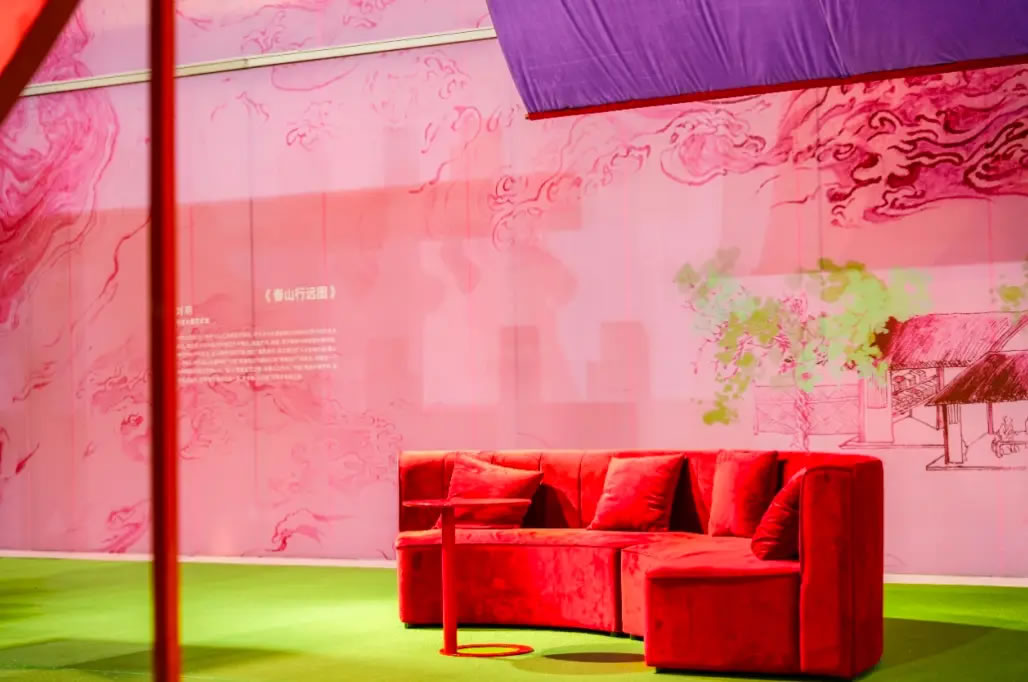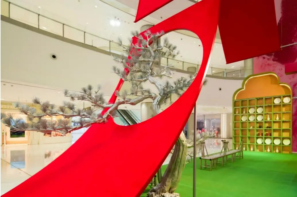 山水,并非遠(yuǎn)行才可得見(jiàn)。書(shū)法水墨藝術(shù)家劉玥首展作品《春山行遠(yuǎn)圖》以20米巨幅“山水開(kāi)卷”,步入其中,與天地春意從容照面;紅色的帷幔落于銀色的松枝上,就像于山間松下靜謐的一隅,“幕下棲心”將是絕佳開(kāi)年時(shí)尚大片的打卡處;松下銀椅,為你與摯友“漫敘往來(lái)”的相聚時(shí)刻營(yíng)造出寧?kù)o、松弛的氛圍;多寶閣中陳列著未經(jīng)雕琢的茶器素胚與場(chǎng)內(nèi)品牌萬(wàn)仟堂,長(zhǎng)沙尼依格羅酒店及tea'stone帶來(lái)的新春茶器,以“初芒蘊(yùn)能”詮釋著未來(lái)的無(wú)限可能與新生力量。轉(zhuǎn)身與“蒔光種愿” 四方亭相遇。葫蘆門(mén)朝四方而開(kāi),寓意著納四方福祿,步入其中,與數(shù)字交互藝術(shù)家吳旭首展作品《無(wú)限福祿》體驗(yàn)互動(dòng),跟隨指引揮動(dòng)手勢(shì),觸發(fā)粒子凝聚為動(dòng)態(tài)“福”字,親手完成一場(chǎng)新春祈福儀式。我們把象征團(tuán)圓與喜悅的紅色沙發(fā)打造“盞間聚暖”,如懷抱般圍合的布局作為“歸處”的隱喻。與家人團(tuán)聚便是心歸處,這將是中國(guó)年最圓滿的意象。