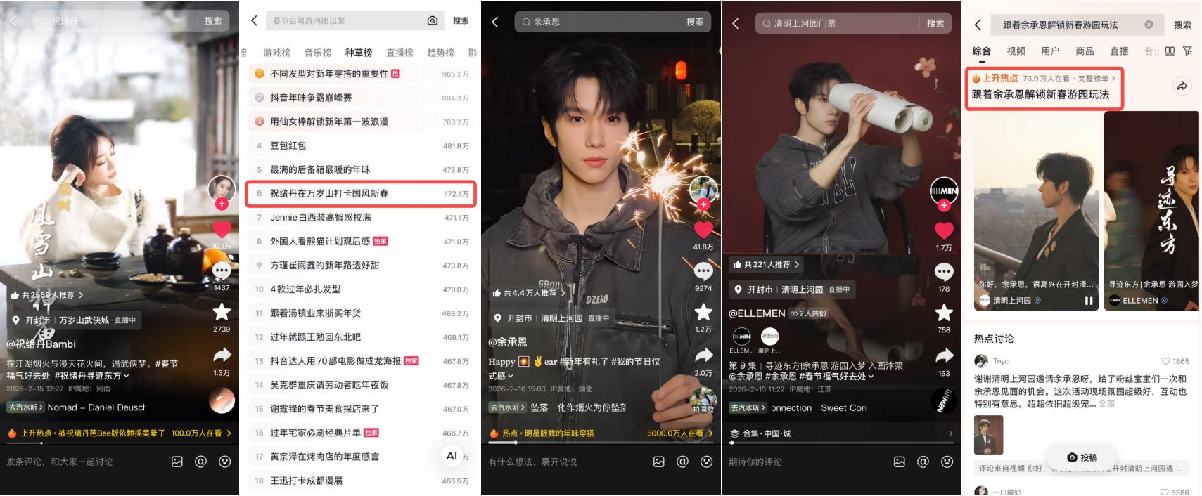 同樣的邏輯也在清明上河園得到了驗證。通過聯(lián)動余承恩開啟#跟著余承恩解鎖新春游園玩法 的宣發(fā),景區(qū)不再是一個靜態(tài)的游覽點,而變成了一個可互動、可沉浸的“大型劇本殺”現(xiàn)場。這種結(jié)合雜志感視頻與藝人視角的傳播方式,讓相關(guān)內(nèi)容累計曝光量突破10億,讓“去開封過年”從一個選項變成了一種風(fēng)潮,抖音生活服務(wù)通過這種極具穿透力的內(nèi)容打法,為景區(qū)建立了極強(qiáng)的搜索權(quán)重與心智溢價。