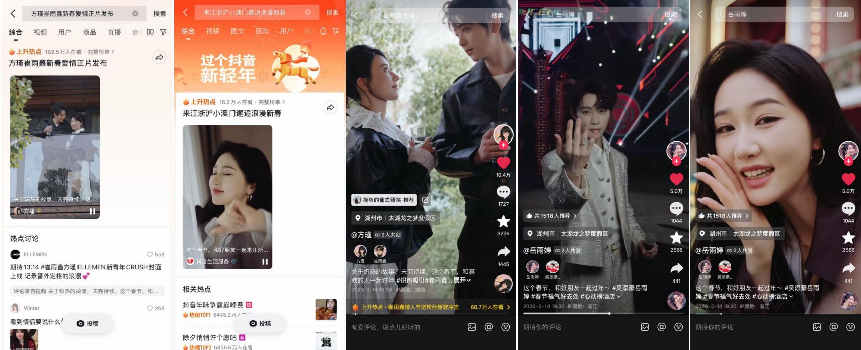 微短劇《這個春節(jié),和“xx”一起過年》,讓太湖龍之夢在這個春節(jié)多了一層身份,它不只是景區(qū),更是演員們演繹人間煙火的敘事背景。太湖龍之夢與抖音生活服務(wù)深度合作,讓岳雨婷、崔雨鑫等演員拍攝系列微短劇,把龍之夢“江浙滬小澳門”的社交標(biāo)簽,打碎了揉進(jìn)愛情與友情的敘事褶皺里。