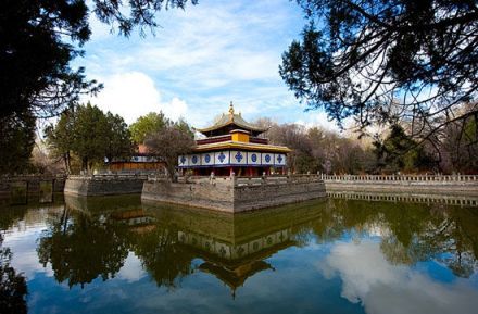 八世達(dá)賴在此基礎(chǔ)上擴(kuò)建了恰白康(閱覽室)、康松司倫(威鎮(zhèn)三界閣)、曲然(講經(jīng)院),把舊有的水塘開挖成湖,按漢式亭臺樓閣的建筑風(fēng)格,在湖心建了龍王廟和措吉頗章宮(湖心宮),兩側(cè)架設(shè)了石橋。