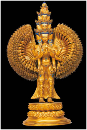 西藏本土制造的宗教文物,以金銅造像最著名。羅布林卡興建之初,七世達(dá)賴為給剛建好的宮殿佛堂添裝佛像及佛教用具,曾在布達(dá)拉宮腳下建立了一所名為“雪堆白”的造像場,匯集了藏區(qū)內(nèi)幾百名能工巧匠,在這里精心打造各種佛像器物,以滿足拉薩及周邊地區(qū)寺院的需求。羅布林卡從初建到最后完善,每座佛堂里的大小佛像都被指定由“雪堆白”工匠量身定做打造。除此之外,園內(nèi)很多佛龕、宗教用具、金頂屋檐、門楣雕飾等,也都出自“雪堆白”工匠之手!把┒寻住痹煜裉攸c(diǎn)是制作精細(xì)、比例勻稱、色彩鮮明艷麗,佛像上的鍍金厚重,鍍金面光潔度高,佛冠、耳墜、臂釧、手鐲、飄帶等飾物,一律用綠松石鑲嵌。這些明顯特征,說明18世紀(jì)中葉以后,西藏本土佛像打造技術(shù)已步入了獨(dú)立發(fā)展的成熟階段。