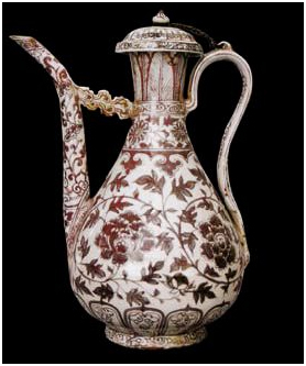 明洪武時期(公元1386年--1398年)贈送的釉里紅牡丹紋執(zhí)壺,高37cm,足徑11cm,這是一件造型端莊美觀大方、繪工精細(xì)、十分鮮見的瓷器。由于釉里紅瓷器燒制難度大,成品率低,在現(xiàn)今中國內(nèi)地保存數(shù)量已很少,而在西藏能完好保存這件瓷品長達(dá)600多年,實(shí)屬難得。