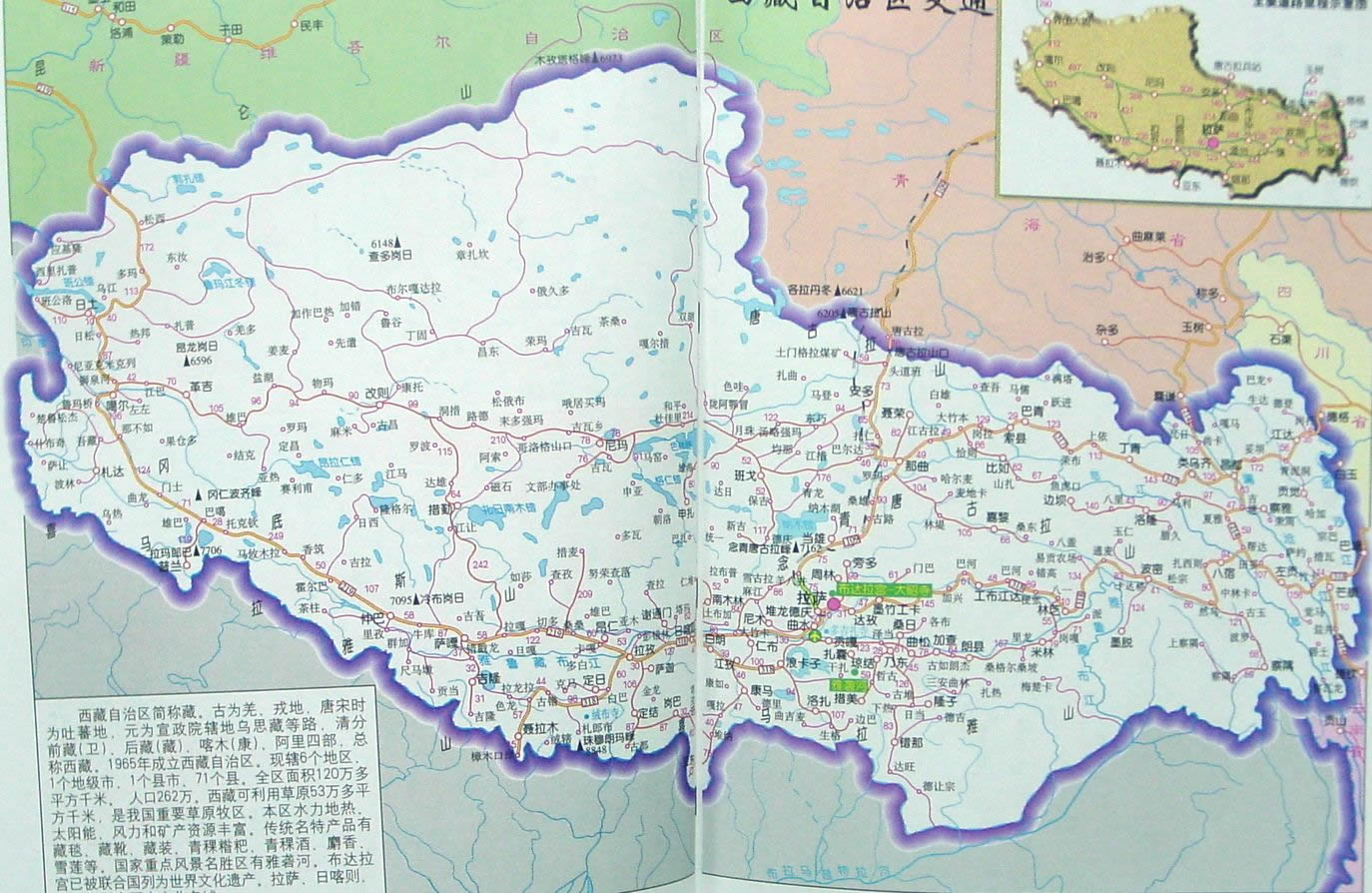 西藏自治區(qū),簡(jiǎn)稱藏。西藏位于中華人民共和國(guó)的西南邊陲,青藏高原的西南部,東經(jīng) 78°25′至99°06′,北緯26°44′至36°32′之間。面積一百二十多萬平方公里,占全國(guó)的1/8,平均海拔4000米以上,是有“世界屋脊”之稱的青藏高原的主體部分。它北臨新疆,東北連接青海,東面與四川相連,東南與云南相鄰,南邊和西部與緬甸、印度、不丹、錫金、尼泊爾接壤,邊境線近四千公里,是我國(guó)與南亞次大陸聯(lián)系的紐帶。其間,綿亙著眾多巨大的山脈,奔流著無數(shù)湍急的流,高原湖泊星羅棋布,林海莽莽,濤聲萬里。西藏的行政區(qū)劃分為1個(gè)地級(jí)市、6個(gè)地區(qū),下轄1個(gè)縣級(jí)市,70個(gè)縣,1個(gè)縣,1個(gè)縣級(jí)區(qū),2個(gè)縣級(jí)辦事處, 899個(gè)鄉(xiāng),31個(gè)鎮(zhèn)。自治區(qū)首府設(shè)在拉薩市。
