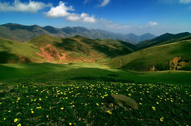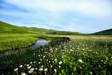 草甸、鮮花、小溪、藍(lán)天、白云、羊群,構(gòu)成了一幅優(yōu)美迷人的圖畫。