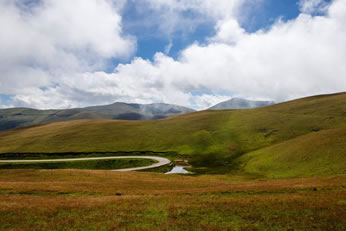 一眼眼山泉匯成一洼洼積水,一洼洼積水連成一道道溪流,隨意在草山之間流淌,曲曲折折,蜿蜒蛇行,時時有水往高處流的錯覺。