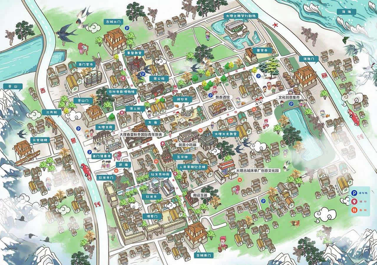 城池的布局為棋盤式,南北城門相互對稱,而東西城門相錯,南北有三條街,東西有六條街構(gòu)成了大理城主要道路格局。城市的中心偏西,南北軸線不居中,形成了西重東輕的城市布局。而東西城門相錯,是采用了白族建筑中的“東西南北不取中正”的原則。
