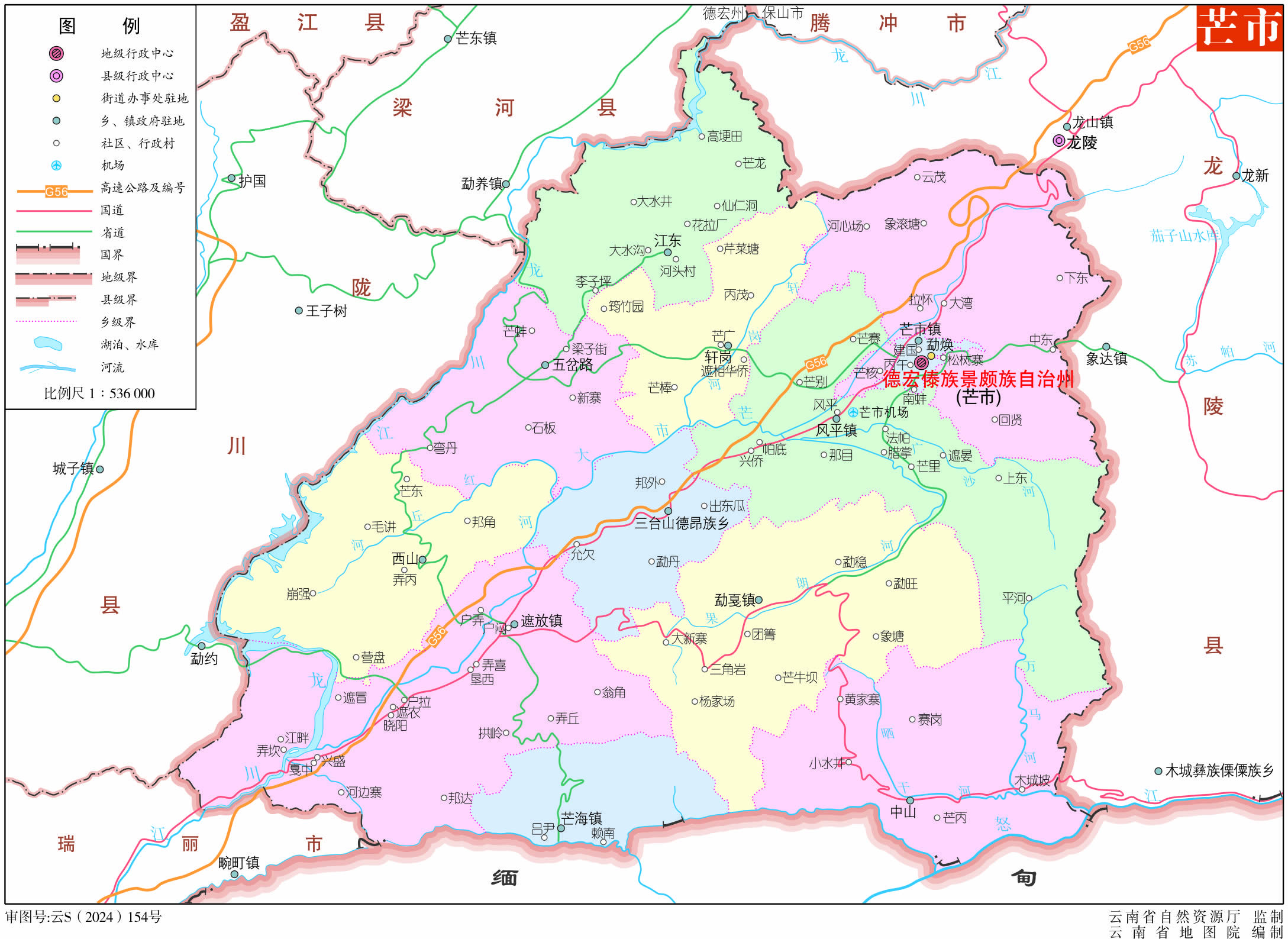 鎮(zhèn):芒市鎮(zhèn)、遮放鎮(zhèn)、勐戛鎮(zhèn)、芒海鎮(zhèn)、風(fēng)平鎮(zhèn)