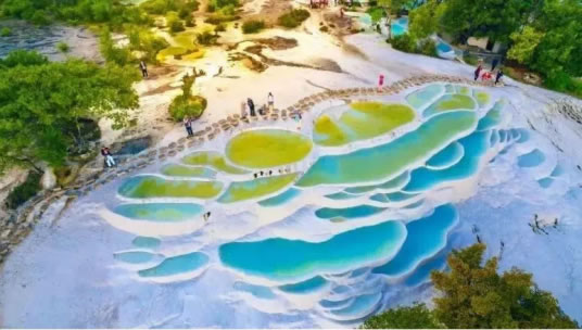白水臺(tái)因碳酸鹽長(zhǎng)年累月的沉淀,形成臺(tái)幔,好似層層梯田,故有“仙人遺田”的美稱,2022年11月9日,白水臺(tái)景區(qū)被確定為國(guó)家AAA級(jí)旅游景區(qū)。