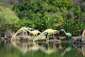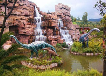 由“侏羅紀大瀑布”、“群龍對峙”、“腕龍相親”、“氣龍追逐”、“雙龍飲瀑”、“霸王龍窺獵”、“侏羅紀叢林”、“海棗之王”、“沙漠之林”等九大景觀真實再現(xiàn)了侏羅紀時代恐龍王國的生活場景,構造出一個1億年前生氣勃勃、繁榮昌盛的侏羅紀世界,讓游客飽享一頓視覺大餐。