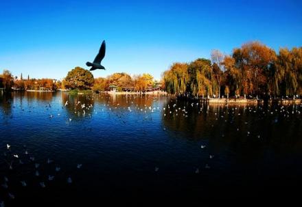 翠湖位于昆明市五華山西麓,占地面積352畝。湖東北有“九泉所出,匯而成池”,故又名“九龍池”。堤畔遍植垂柳,柳枝拂面,湖內(nèi)多種荷花,藕花飄香,舊有“十畝荷花魚世界,半城楊柳撫樓臺”之聯(lián),被譽(yù)為“城中碧玉”。有亭、臺、回廊、曲橋等建筑,其建筑精致玲瓏,亭閣均有匾對,歌詠園中的景觀。
