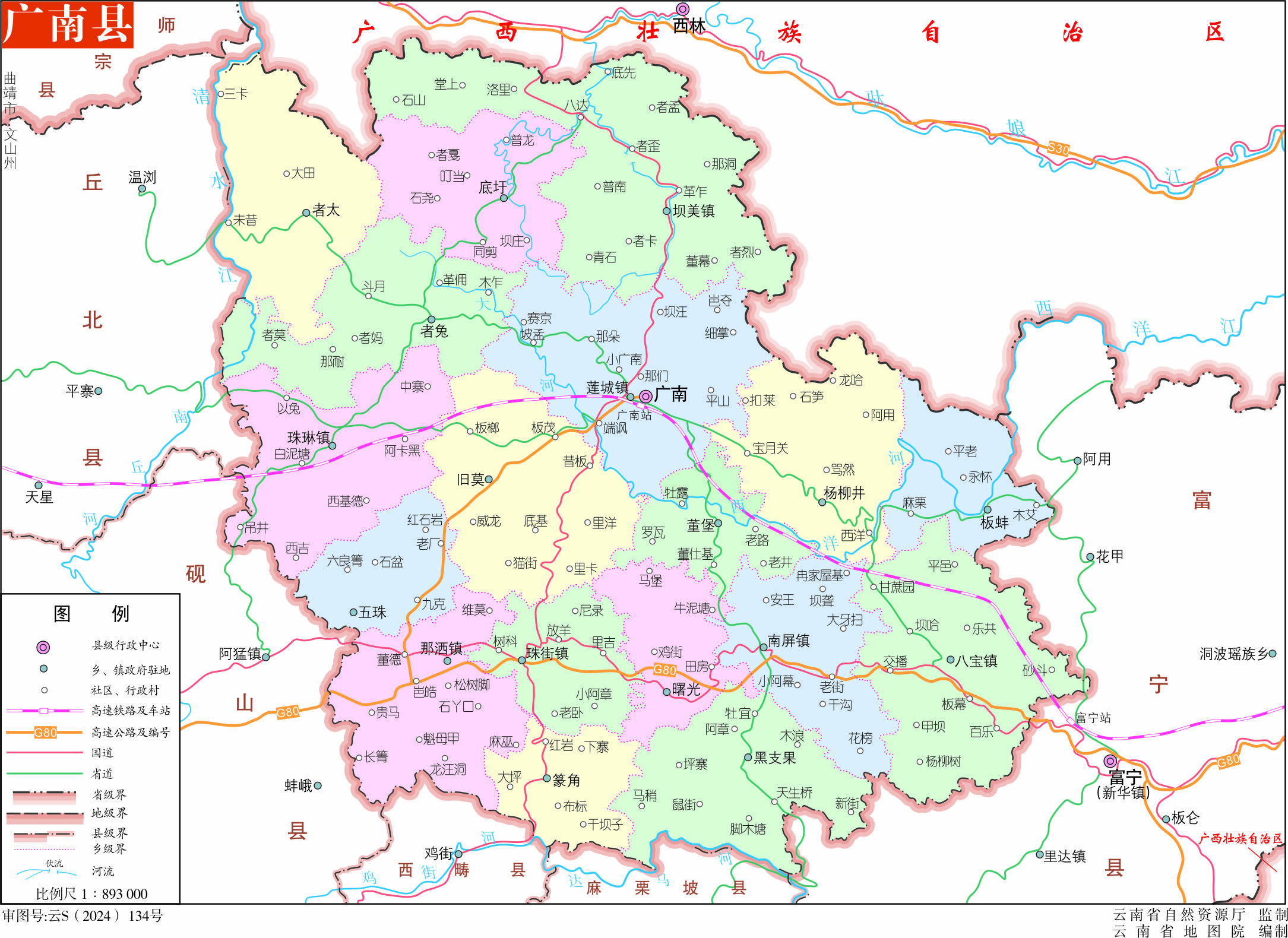 位置境域 廣南縣位于云南省東南部,在文山州東北部,地處滇、桂、黔三。▍^(qū))交界處。東與富寧縣接壤,南與西疇縣、麻栗坡縣毗鄰,西鄰丘北縣、硯山縣,北接廣西壯族自治區(qū)西林縣,與貴州省興義市相望?h境東西相距105公里,南北相距103公里。全縣國(guó)土面積7810平方公里。