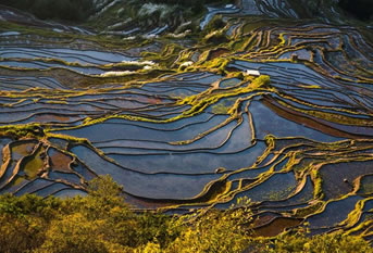 元陽梯田,位于云南省紅河州元陽縣的哀牢山南部,是哈尼族人世世代代留下的杰作。元陽梯田是紅河哈尼梯田的核心區(qū)。紅河哈尼梯田是以哈尼族為主的各族人民利用特殊地理氣候同墾共創(chuàng)的梯田農(nóng)耕文明奇觀,規(guī)模宏大,氣勢磅礴。元陽哈尼族開墾的梯田隨山勢地形變化,坡緩地大則開墾大田,坡陡地小則開墾小田,甚至溝邊坎下石隙也開田,因而梯田大者有數(shù)畝,小者僅有簸箕大,往往一坡就有成千上萬畝。