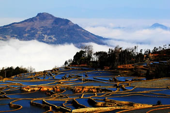 元陽梯田主要有3大景區(qū):壩達(dá)景區(qū)(包括箐口、全福莊、麻栗寨、主魯?shù)冗B片1.4萬多畝的梯田),老虎嘴景區(qū)(包括勐品、硐浦、阿勐控、保山寨等近6000畝梯田),多依樹景區(qū)(包括多依樹、愛春、大瓦遮等連片上萬畝梯田)。如此眾多的梯田,在茫茫森林的掩映中,在漫漫云海的覆蓋下,構(gòu)成了神奇壯麗的景觀。