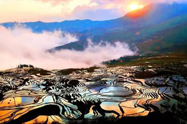 紅河哈尼梯田位于云南南部,遍布于紅河州元陽、紅河、金平、綠春四縣,總面積約100萬畝,僅元陽縣境內(nèi)就有17萬畝梯田。元陽梯田是哈尼族人1300多年來生生不息地“雕刻”的山水田園風(fēng)光畫。2013年(癸巳年)6月22日在第37屆世界遺產(chǎn)大會上紅河哈尼梯田被成功列入世界遺產(chǎn)名錄,成為中國第45處世界遺產(chǎn)。