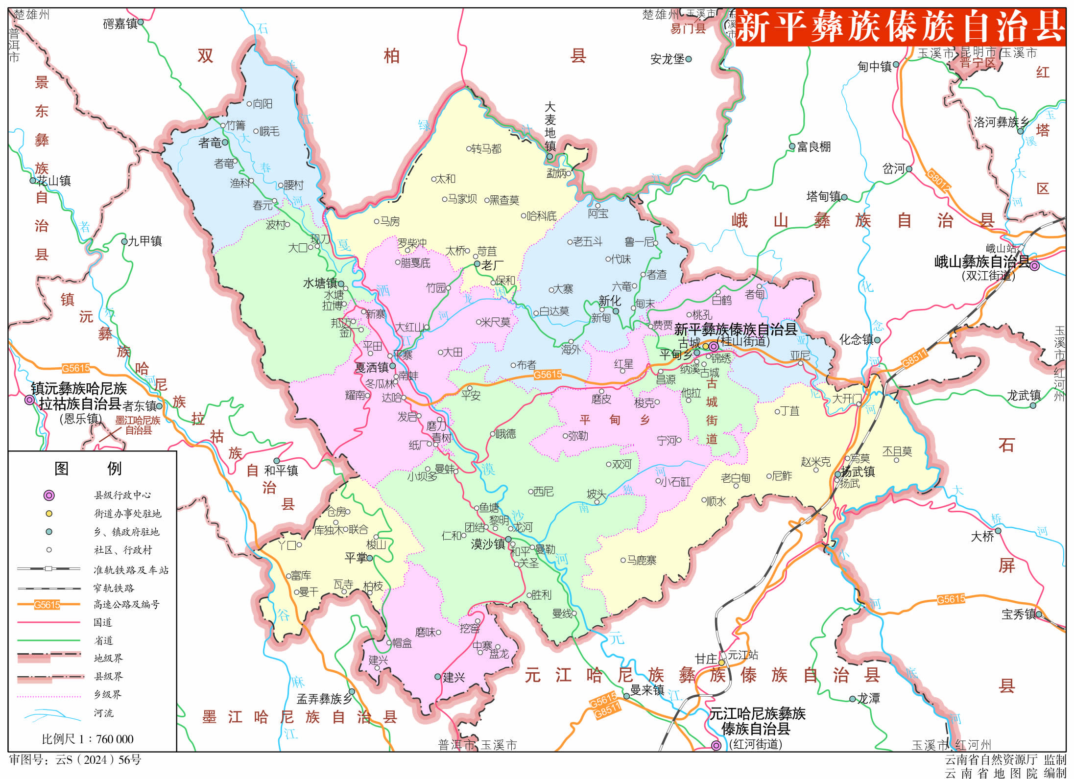 新平彝族傣族自治縣(簡稱新平縣)是玉溪市下轄縣,明萬歷年間置縣,意為新近平定之地。新平縣東與峨山縣毗鄰,東南與石屏縣接壤,南連元江哈尼族彝族傣族自治縣,西南接墨江哈尼族自治縣,西與鎮(zhèn)沅縣相接,北與雙柏縣相望。距昆明市180公里,距玉溪市90公里。全縣國土面積4223平方公里,轄6鄉(xiāng)4鎮(zhèn)2街道、124個村(社區(qū))、1459個村(居)民小組。新平彝族傣族自治縣常住人口為262771人。